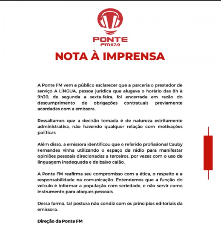 Em nota a radio ponte fm esclarece a saida do ex colaborador Cauby Fernandes e rebate os possiveis motivos politicos dito pelo o mesmo.